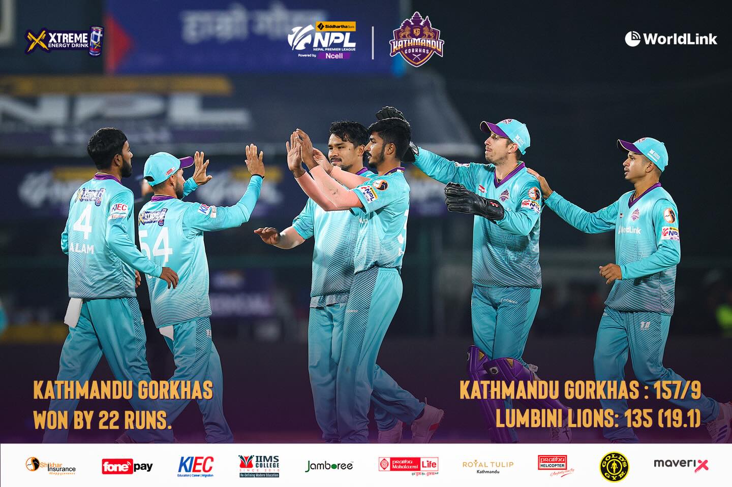 काठमाडौं गोर्खले लुम्बिनी लायन्सलाई २२ रनले हराउँदै आफ्नो दोस्रो जित दर्ता गर। कीर्तिपुरको त्रिवि अन्तर्राष्ट्रिय क्रिकेट रंगशालामा भएको नेपाल प्रिमियर लिग (एनपीएल) दोस्रो संस्करणमा सो परिणाम आएपछि गोर्खाज शीर्ष पंक्तिमा चढ्ने सम्भावनाियो रह्यो।